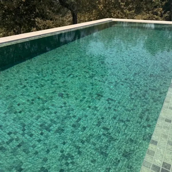 La mosaïque pour piscine verte transforme la perception de la couleur de l’eau selon l’heure de la journée. En plein soleil, la teinte devient lumineuse et vibrante ; au crépuscule, elle prend des reflets doux, presque veloutés. Ce dynamisme visuel fait partie des raisons pour lesquelles le vert est si attractif.